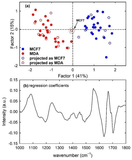Furthermore, the PLS model developed from the calibration samples of the MCF7 and MDA cells rightly discriminates metastatic from malignant cells according to Factor 1, as visible in Figure 10a with the filled circles. The regression coefficients of the PLS model with two components are plotted in Figure 10b: the spectral shape of such plot is analogous to that of Figure 3c, which reports the difference spectrum between MCF7 and MDA mean spectra. Therefore, it can be deduced that two LVs correctly discriminate metastatic cells from malignant ones. Furthermore, in this case, the prediction ability of the model was good but not perfect because one MCF7 sample of the test set was misclassified, as reported in Table 1. The obtained sensitivity value was 100%, whereas the accuracy and specificity values were 95% and 90%, respectively. The misclassified sample is also visible in Figure 10a as red hollow circles which have been labelled for clarification purposes. In a comparison of the results obtained by the PLS-DA classification with those of the PCA-LDA classification, it is evident that the latter has a better performance in terms of accuracy and specificity.