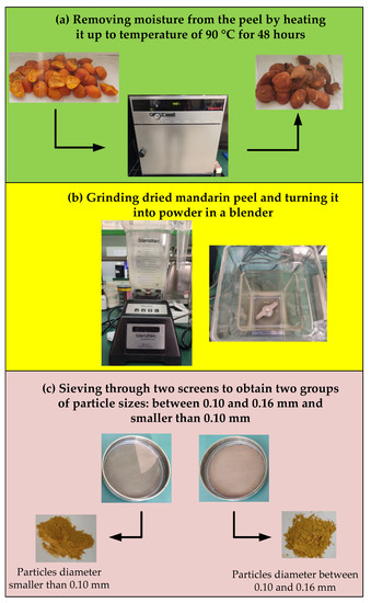 Figure 2 shows the whole procedure for the preparation of MPP. First, the mandarin peels were dried in an oven for 2 days at 90 °C to completely dehydrate the source material (Figure 2a). After dehydration, the peel was ground in a blender to obtain a fine powder (Figure 2b). The MPP was then sieved through two sieves (the openings of the sieves were 0.10 and 0.16 mm), thus dividing it into two groups regarding particle size: from 0.10 to 0.16 mm, and less than 0.10 mm (Figure 2c).