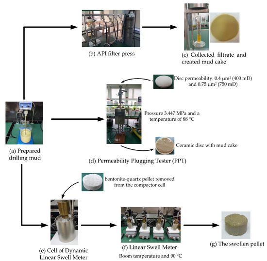 All tested drilling-mud samples were prepared in accordance with the American Petroleum Institute Standards, API Specifications 13A and API 13B-1 [44]. To determine the effects of the adding MPP on filtration properties and clay swelling, nine drilling mud samples were prepared and subjected to laboratory testing: