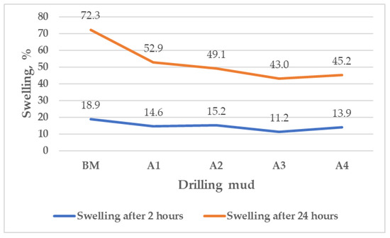 After 2 h, the swelling of the pellets in the different formulations of mud A was reduced regardless of the concentration of MPP, and ranged from 11.2% to 15.2% compared to the swelling of the pellets in the base mud (18.9%). After 24 h, pellet swelling was also reduced regardless of MPP concentration, and ranged from 43% to 52.9% compared to pellet swelling in the base mud (72.3%). With the addition of MPP, pellet swelling was 52.9% at the lowest tested concentration of 0.5% by volume of water (A1), while increasing the concentration up to 2% did not express the same intensity of pellet-swelling decrease. Moreover, a slight increase of 2.2% in pellet swelling (from 43% (A3) to 45.2% (A4)) was observed after the addition of MPP at a higher concentration than 1.5% by volume of water.