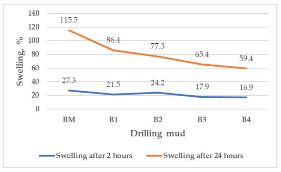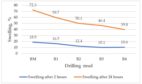 After 2 h, the swelling of the pellets in the different formulations of mud B was reduced regardless of the concentration of MPP, and ranged from 16.9% (B4) to 24.2% (B2) compared to the swelling of the pellets in the base mud (27.3%). After 24 h, the swelling of the pellets also decreased regardless of the concentration of MPP, and ranged from 59.4% (B4) to 86.4% (B1) compared to the swelling of the base mud (115.5%). As the concentration of MPP increased, the swelling of the pellets continuously and significantly decreased, from 86.4% (B1) to 59.4% (B4).