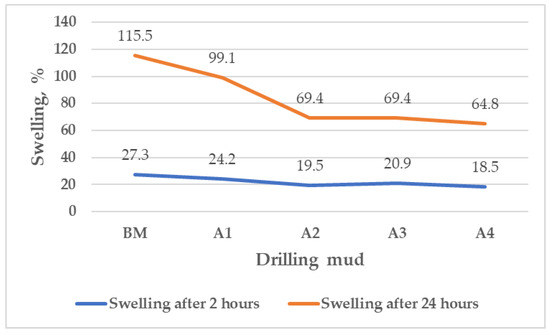 After 2 h, the swelling of the pellets was lower regardless of the concentration of MPP, ranging from 18.5% to 24.2% compared to the swelling of the pellets in the base mud (27.3%). After 24 h, the swelling of the pellets was also decreased regardless of the concentration of the MPP, and ranged from 64.8% (A4) to 99.1% (A1) compared to the swelling in the base mud (115.5%). Increasing the concentration of MPP from 0.5% (A1) to 1% by volume of water (A2), pellet swelling continued to decrease (from 99.1% (A1) to 69.4% (A2)), but this trend did not continue with the same intensity with a further increase in MPP concentration, so the pellet swelling was 69.4% (A3) and 64.8% (A4).