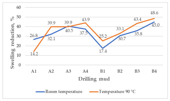 Regardless of the concentration of MPP and particle size, a decrease in pellet swelling between 17.4% (B1) and 45% (B4) was observed at room temperature, and a decrease in swelling between 14.2% (A1) and 48.6% (B4) was determined at 90 °C. When the concentration of MPP increased, the reduction in pellet swelling increased for mud samples containing particles from 0.1 to 0.16 mm (mud samples B1–B4), from 17.4% (B1) at a concentration of 0.5% by volume of water up to 45% measured with mud B4 containing 2% by volume of water at room temperature. At 90 °C, results were similar to those measured at room temperature, but the reduction in pellet swelling was slightly greater, from 25.2% (B1) to 48.6% (B4).