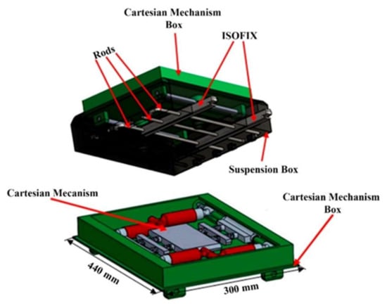 The mechanism was designed according to the R129 standard [13]. The mechanism aims to dissipate the impact energy generated by a traffic accident transferred to the infant. The mechanism was made with a set of springs and dampers since they do not depend on an external energy source to activate, and the speed response is satisfactory, allowing displacement in the 3 Cartesian axes (x, y, z) [14,15,16]. The components and dimensions of the mechanism were generated by SolidWorks® software and are divided into two parts: the Cartesian mechanism box and the suspension box, as is shown in Figure 1.
