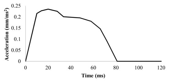 For the Cartesian mechanism box, suspension box, J1, J2, C, and T, the mechanical properties are set as: aluminum 1100-H14 density of 2.71 × 10−6 kg/mm3, Young’s modulus of 70 GPa, an elastic limit of 0.095 GPa, and Poisson’s ratio of 0.33 [19]. For M1 and M2, properties are those of A36 structural steel: density of 7.85 × 10−6 kg/mm3, Young’s modulus of 200 GPa, an elastic limit of 0.25 GPa, and Poisson’s ratio of 0.32 [20]. The initial system speed is 13.34 m/s on the +x and +y-axes. The deceleration peak in the −x and −y directions are taken from the FMVSS 213 regulation for frontal impact (Figure 4) [21]. The same peak is used in both directions to obtain values on its performance under critical situations. The suspension box decelerates, as is shown in Figure 4. Its movement on the z-axis is restricted to simulate that its placement on the vehicle’s rear seat with ISOFIX anchorage. Additionally, a translational joint from the suspension box to the Cartesian mechanism box was implemented. In this way, the Cartesian mechanism box will move along the z-axis concerning the suspension box. Gravity acts on the axis −z with a constant value of 0.00981 mm/ms2.