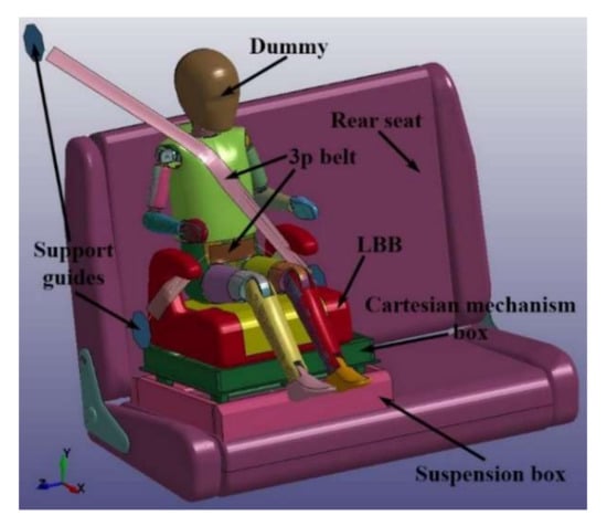 Polypropylene mechanical properties were used for the LBB and connector with the backrest. The rear seat cushions have a density of 9 × 10−7 kg/mm3, Young’s modulus of 1.35 GPa, yield strength of 0.036 GPa, and Poisson’s ratio of 0.3 [24]. Foam DAX 55 was selected, whose mechanical properties are: density of 3.5 × 10−8 kg/mm3, Young’s modulus of 5 × 10−5 GPa, Poisson’s ratio of 0.31 LBB, and vehicle rear seat cushions [25]. For this type of material, it is necessary to add the stress–strain curve [26]. In the Cartesian mechanism box, suspension box, J1, J2, C, and T parts, the mechanical properties of aluminum 1100-H14 are used: density of 2.71 × 10−6 kg/mm3, Young’s modulus of 70 GPa, an elastic limit of 0.095 GPa, and Poisson’s ratio of 0.33 [20]. As for M1 and M2, A36 structural steel is used: density of 7.85 × 10−6 kg/mm3, Young’s modulus of 200 GPa, an elastic limit of 0.25 GPa, and Poisson’s ratio of 0.32 [21]. The seat belt made by one-dimensional elements is 5.97 × 10−4 kg/mm [27]. The mechanical properties of Nylon were implemented for the two-dimensional elements: density of 1 × 10−6 kg/mm3, Young’s modulus of 5.333 GPa, an elastic limit of 0.08 GPa, and Poisson’s ratio of 0.3. Load and unload curves representing the axial force as a seat belt function were used [28]. The assembly of all parts that were set up in the analysis was maintained in LS-DYNA® software, as shown in Figure 5.