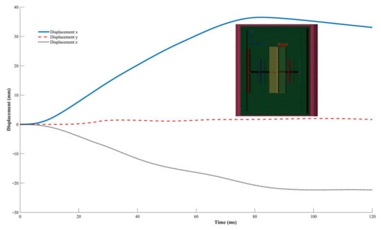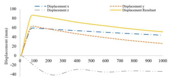 The results obtained from the coupling system showed that the simulated period was 1000 ms, and data were obtained every 1 ms. The piece of interest is C in the system. The assessed displacement values within the Cartesian mechanism box on the x-, y-, and z-axes during the analyzed interval are shown in Figure 6.