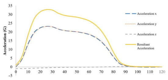 The deceleration of x and y are similar since the curve in Figure 4 was implemented for both axes. Both axes obtain a maximum deceleration of 23 G, and it remains from 21 G to 17 G for 30 ms. After 65 ms, it decreases from 17 G to 0 G. In the z-axis, it is observed that it begins at 1 G; the gravity acceleration is set on the axis -z, and the system counteracts the gravitational acceleration in 31 ms, which becomes 0 G.