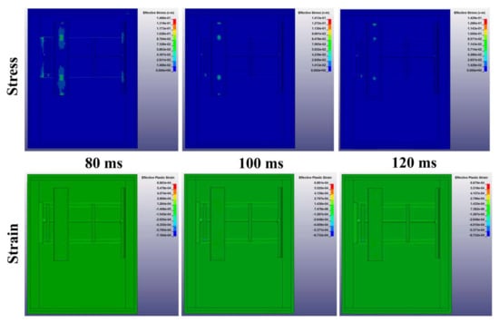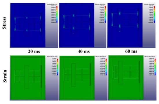 The resulting acceleration reaches a maximum value of 33 G. The stresses (using Von Mises’ failure theory) and strains of each mechanism’s parts during the first 120 ms are obtained. The values are plotted every 20 ms of the Cartesian mechanism; this part records the mechanism’s highest values of stress and strain (Figure 8).