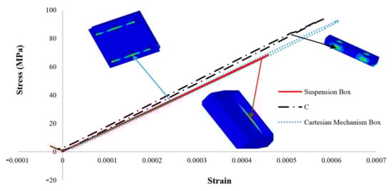 The C part has the highest stress with 94 MPa; the stress of the Cartesian mechanism box is 92 Mpa, that of the suspension box is 68 MPa, and the M1 and M2 parts have the lowest stress in the first 120 ms. The mechanical properties of the material, knowing that it has an elastic limit of 95 MPa, guarantee that the parts of the mechanism work in the elastic zone since they do not exceed the yield point (Figure 9).
