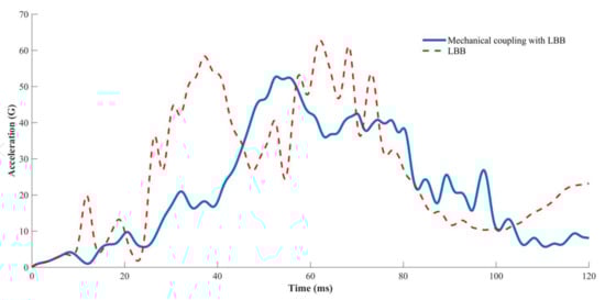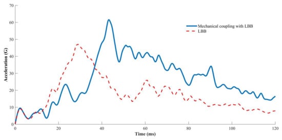 The LBB begins to increase the acceleration from 3 G at 7 ms until reaching the maximum acceleration of 47 G at 29 ms and descends to 14 G at 54 ms, and then there is an increase to 26 G at 61 ms, which begins to descend to 8 G at 120 ms. As a result, it generates a Chest Severity Index (CSI) of 281.9. On the other hand, implementing the mechanical coupling allows an initial displacement, causing the acceleration to start from 3.6 G at 14.6 ms until reaching the maximum acceleration of 60.8 G at 44 ms. After that, it decreases to 37 G at 48 ms, increases again to 46 G at 52 ms, and decreases to 16.2 G at 120 ms, generating a CSI of 375.6 (Figure 14).