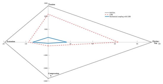 The LBB generates a higher injury rate, causing tension of 2162 N and a deflection of 63.2 Nm. Therefore, when implementing the mechanical coupling with LBB, the flexion and extension are kept below 20 Nm, and the maximum stress is 371.5 N (Figure 13).