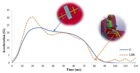 Figure 16 shows that part C of the system minimizes deceleration and smooths the curve. A maximum deceleration of 22.5 G is obtained in C and 30.5 G in LBB, that is, a variation of 8 G. After 50 ms, C remains at 0 G, while the LBB keeps oscillating at 2.5 G. The variation is because the system dissipates part of the impact energy, transmitting less energy to the infant.