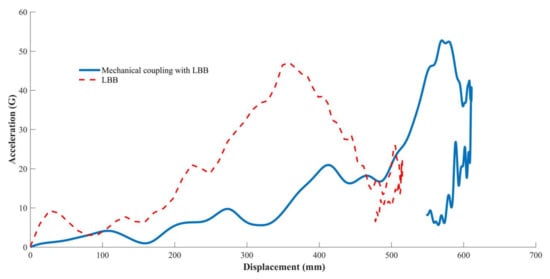 The seat belt retention with the LBB generates an acceleration of 9.3 G with a displacement of 27 mm, and at 93 mm, it begins to increase the acceleration until it reaches the maximum value of 47 G with a displacement of 360 mm. When the dummy is separated by 360 mm from the rear seat, the seat belt retains it, generating an acceleration of 47 G. When this occurs, the dummy continues a displacement of 152 mm to decrease the acceleration. The implementation of the mechanical coupling with LBB allows the dummy to have a more significant displacement, so it generates an acceleration of less than 9.5 G during the first 352 mm and then begins to increase the acceleration to 20 G at 420 mm; however, decreasing the acceleration to 17 G at 494 mm begins the retention, generating a maximum acceleration of 52 G with a displacement of 572 mm. The displacement reached by the system on the x-axis of 36.5 mm requires decreasing the acceleration to 52 G (Figure 18).