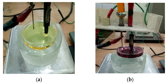 A reaction cell of volume 100 mL containing hydrogen tetrachloroaurate(III) trihydrate HAuCl4·3H2O was used as a precursor. The precursor solution was exposed to atmospheric pressure microplasma plasma for 20 min (named Au-20). The microplasma discharge provides a cascade of electrons and other plasma species which interact with precursor solutions to form gold NPs. The change of color of the solution from golden (Figure 1a) to purplish (Figure 1b) after 2–3 min of plasma exposure time was the first visual indication of the formation of gold nanostructured particles. To prepare the second sample of Au-PVP nanostructured composites (named Au-PVP-20), an amount of 0.028 gm of Polyvinylpyrrolidone PVP, (Molecular Weight = 40,000; 111.14 g/mole) was added and magnetically stirred for 20 min. Further, the color of Au-PVP-20 remained the same as that of Au-20.
