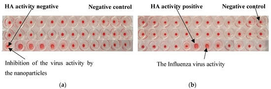 To examine the inhibitory properties of gold nanostructured particles and PVP-gold nanostructured composites in the pre-entry stages of the influenza virus life cycle, we tested the tendency of these nanostructured particles to inhibit hemagglutination by the method referenced by Alexander and Chettle [42]. In a typical HA test, the comparison of the Influenza H9N2 virus’ tendency to agglutinate chicken Red Blood Cells (RBCs) and the gold nano-structured particles’ property of inhibiting virus agglutination was studied. Our findings based on the observations on the HA protocol evidenced that gold nano-structured particles synthesized by the atmospheric pressure microplasma technique showed an inhibition of the H9N2 influenza virus activity of agglutinating Chicken RBCs, as has already been shown in Figure 3 in Section 2.2 (HA).