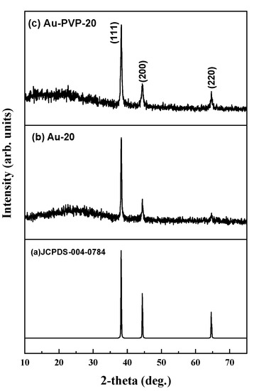 The crystallinity and phases of gold nanostructured in samples Au-20 and Au-PVP-20 were probed with Bruker D8 DISCOVER Advance in Bragg–Brentano mode with Cu Kα radiation (40 KV, 1.54 A, and 40 mA) over 2Ɵ angle ranging from 10° and 70°. The samples for XRD analysis were prepared by drop-casting colloids separately on glass strips followed by drying at room temperature. The XRD data were compared with the JCPDS data card 04-0784 for gold, as depicted by graph (a) in Figure 4. The patterns of Au-20 and Au-PVP-20 appeared to be identical, as shown by graphs (b) and (c), respectively, in Figure 4. The Bragg’s reflections peaks of both samples appeared at 38.24°, 44.3°, and 64.7°, corresponding to (111), (200), and (220) planes, respectively, indicating the FCC lattice.