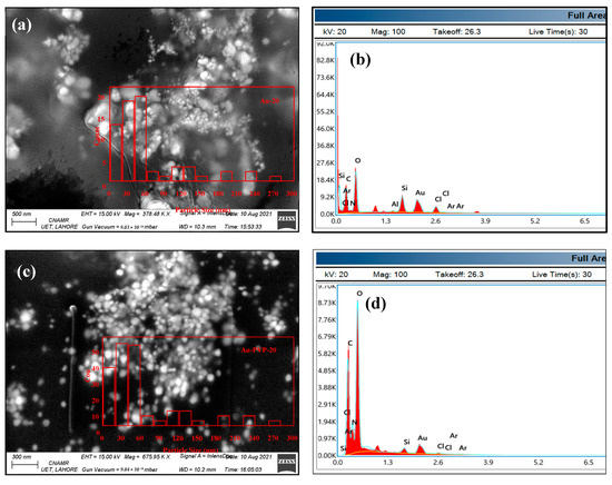 The Energy Dispersive X-ray (EDS) spectroscopy of both samples was executed for the elemental analysis of Au-20 and Au-PVP-20. The spectrum in Figure 5b confirms metallic gold, masked by C and O peaks present in D-Fructose. Cl is the constituent of the gold precursor (HAuCl4.3H2O), while the Si peak is due to the substrate. Argon is present because of being a base gas to produce plasma. Figure 5d is the EDX spectrum of Au-PVP-20, where the same elemental peaks of Au-20 appear with an extra N peak due to PVP capping. The N peak confirms the PVP capping [30]. The inset histogram shows the size distribution of nanostructured gold particles and nanostructured gold-PVP composites extracted from SEM micrographs. It depicts that in both the cases, the size ranged from 1 nm to 270 nm, with the maximum number particles in the size range of 30 nm to 60 nm.