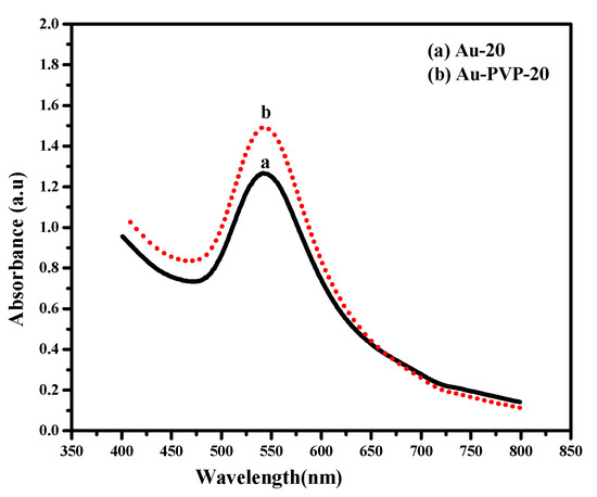 In the present investigations, the UV-VIS spectroscopic studies of Au-20 and Au-PVP-20 were accomplished by using Agilent Technologies Cary 60 ranging from 200–800 nm, with a resolution of 1 nm. The absorbance spectrum of Au-20 exhibited a maximum peak at the wavelength of 541 nm, whereas Au-PVP-20 exhibited a maximum peak at 542 nm, as shown in Figure 7, which lies within the range previously reported (520 nm–580 nm) for gold nanostructured particles with a size range of 10 nm–100 nm [28,35]. There was no reasonable shift in the maximum absorption in Au-PVP-20 as compared to Au-20. This is because the immediate mixing of PVP with gold nanoparticles gives no sufficient time for Au-20 nanostructured particles to agglomerate or to change the effective cores of nanostructured particles [36]. PVP itself is best known for its stability, which has prevented the Au-20 nanostructured particles to agglomerate [37]. Particularly, previous investigations suggest that the maximum absorption peak is red-shifted with an increase in the size of the nanostructured particles and blue-shifted with the decrease in nanostructured particles’ size [28,37].
