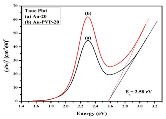 By using the UV-Vis absorption spectra of Au-20 and Au-PVP-20, the optical bandgap was determined by exploiting the Tauc equation, which is a relation between the absorption coefficient α, and Eg is the bandgap energy Eg. [39,40].