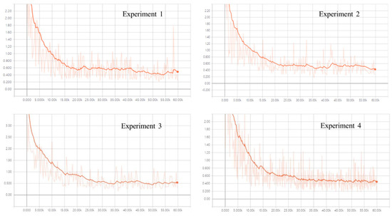 The training loss of each experiment is shown in Figure 8. It can be seen that each experiment converged faster, and after training to 30,000 rounds, the change in the loss decreases and the curve tends to be smooth, with the least oscillation occurring in Experiment 4, i.e., the experiment with the input being the Shuishu_T dataset.