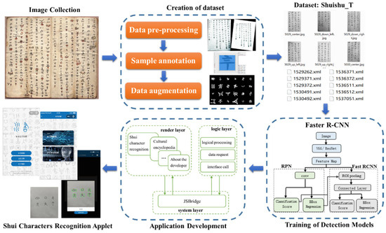 Shui manuscript characters recognition is a small-target and multi-target detection problem, with the focus being on whether the characters in Shui manuscripts can be accurately detected and recognized. The above experimental results show that YOLO and SSD have many problems detecting small and multiple targets. Thus, Faster R-CNN is the most suitable for the detection and recognition of Shui manuscript characters. Furthermore, in 2018, Julca-Aguilar and Hirata [25] proposed the use of Faster R-CNN as a method for detecting symbols in handwritten graphics, and experimentally evaluated it on graphical and mathematical expression datasets. Their results showed that Faster R-CNN can be effectively used for handwritten symbol recognition. In 2019, Yang et al. [26] proposed an improved Faster R-CNN algorithm for natural scene text detection. They reported experimental results demonstrating that it improved the detection of small target characters. Considering the successful application of Faster R-CNN in text detection reported by these two studies and the results of our evaluation experiments, we chose Faster R-CNN to train the Shui manuscript characters recognition model and applied it to the development of the mobile applet.