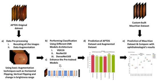 The workflow shown in Figure 1 is as follows: (1) data pre-processing and augmentation (for the APTOS dataset only); (2) training and enhancing the CNN models using the original and augmented APTOS dataset; (3) analyzing results; and (4) classification of the images for the 3 datasets and comparison to actual data.