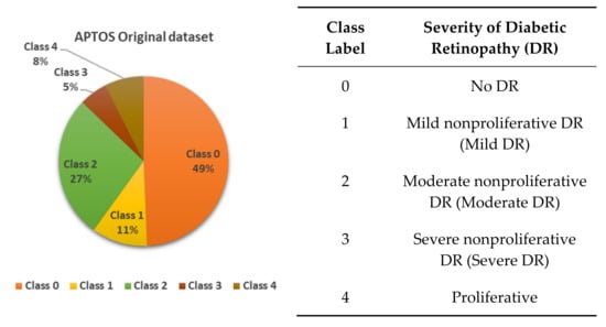 In this research work, two fundus image datasets were used. The first dataset was the APTOS 2019 diabetic retinopathy dataset, which is publicly available online on Kaggle (https://www.kaggle.com/c/aptos2019-blindness-detection/data, accessed on 17 February 2022). This dataset was selected among the other publicly available datasets since it is from India, which is close to the Mauritian population in terms of ethnicity. The second dataset was created locally from the images obtained from the hospitals in Mauritius. Each image in the APTOS 2019 dataset was assigned a class label of 0–4 according to the severity of the disease, as shown in Figure 2. Each image from the local cohort was also assigned a class label of 0–4 by a local doctor. The original dataset obtained from Kaggle is termed as the original APTOS dataset. The class distribution of the original APTOS dataset is illustrated in Figure 2.