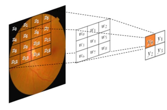 In this paper, transfer learning (TL) using the architectures of the three CNNs models, ResNet50, VGG16 and DenseNet169, was applied to the diabetic retinopathy images. In TL, learned features from one task are applied to a different task without having to learn from scratch. This is commonly used when building CNN models since the process of training from scratch requires a lot of computational resources, large datasets and a lot of time [31]. CNN models consist of multiple layers, namely: the convolution layer, pooling layer and fully connected layer. CNN models employ multiple perceptrons to evaluate picture inputs and eventually extract different patterns from the images to output to the fully connected layer. Our CNN models extracted representative patterns to form the feature maps. A 3 × 3 kernel was passed over the input matrix of the diabetic retinopathy image, as illustrated in Figure 4.