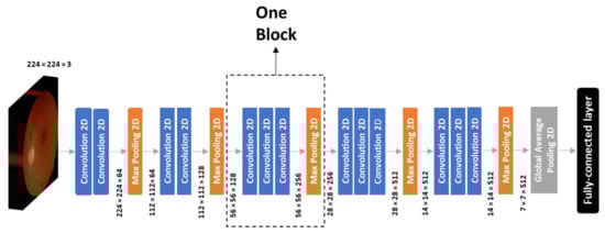 The VGG16 model, a CNN architecture pre-trained on the ImageNet dataset, was adopted for the development of our diabetic retinopathy application as it has been fully tested in a similar domain, achieving good performance [32,33]. VGG16 consists of 13 convolutional layers and 3 fully connected layers. There are 5 blocks each containing 2 or 3 convolution layers and ending with a max-pooling layer, as illustrated by Figure 5. A fixed-size image of dimensions (224, 224, 3) is the input to the VGG16 model.