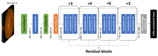 ResNet50, another popular CNN architecture, consists of 50 layers organized in so-called residual blocks [9]. It is known for its skip connection approach, which eventually solves the vanishing gradient problem. ResNet50 contains 48 convolution layers along with 1 MaxPool and 1 AveragePool layer. This was desired in our diabetic retinopathy application as it allows the later layers to learn lesser semantic information that was captured in the early layers. A 3 × 3 filter was used to perform the spatial convolution, which was eventually reduced using the max-pooling method. Figure 6 illustrates the ResNet 50 model with the 48 convolution layers and the 16 skip connections.