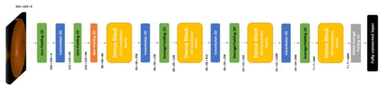The third model that was considered was the DenseNet169 model [34]. Compared to the ResNet50 model, it has more layers. However, it contains a similar block to skip connections called the dense block. With the increase in the number of layers, it gives the model the opportunity to learn more distinctive features. In fact, the architecture consists of four dense blocks with varying numbers of layers as illustrated in Figure 7. Our design for this model consisted of the 2D average pooling, which is in the original architecture, where a dropout layer set to 0.5 was added.