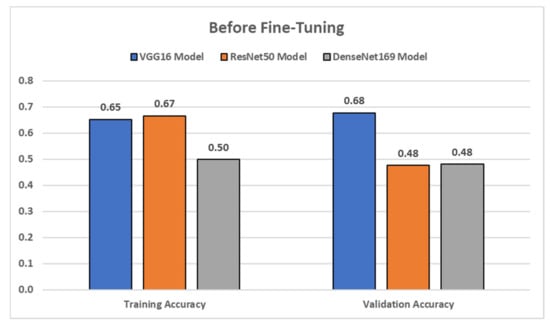 To evaluate the trained models both before and after fine-tuning, the accuracy regarding training, validation and test sets was calculated. Classification accuracy is the fraction of predictions that a given model predicted correctly. Firstly, a custom-built CNN model similar to that developed by Jayalakshmi et al. [45] was used. The same fully connected layers as in the case of our pre-trained models were joined, and the hyperparameters were tuned to obtain the optimal accuracy. A classification accuracy of 0.73 was obtained here. The model was only able to correctly predict classes 0 and 2. Although the accuracy is quite satisfactory for a binary classification of DR and NoDR, this custom-built model is very limited in the case of a multiclass DR classification. Next, pre-trained networks were implemented. The training and validation accuracy obtained before fine-tuning of the pre-trained networks are illustrated in Figure 8. From the results, it was found that the accuracies were quite low for the models ResNet50 and DenseNet169. Hence, it was deduced that these models were underfitting.