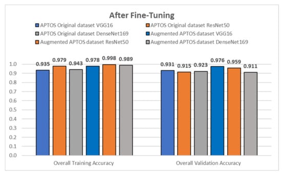 From Figure 8 and Figure 9, it can be clearly seen that fine-tuning the models improved both the training and the validation classification accuracy of the three models for the original APTOS dataset. We also noticed that using the augmented data improved the generality of transfer learning for the models for both the training and validation data. This can be deduced from the accuracy for the augmented dataset being maintained or increasing across all models compared to the original dataset. Furthermore, ResNet, with the highest accuracy in all cases, showed a better generalization. In parallel, it was also observed that the time taken to train the model decreased considerably (by at least 3 h).