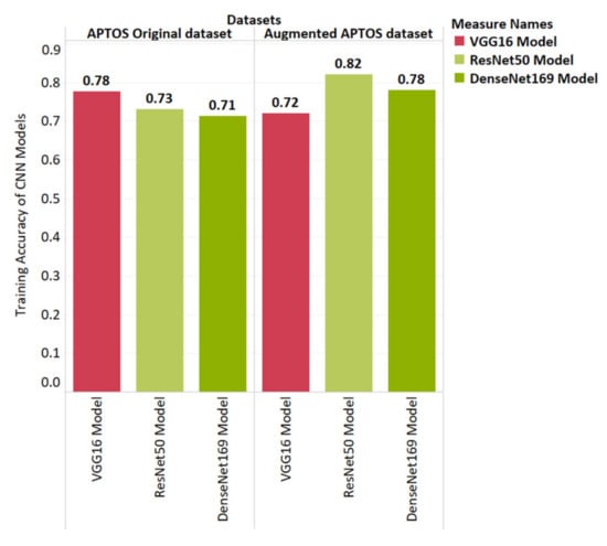 Next, the six models were used to predict the class of the images in the testing data of both the APTOS and the Mauritian datasets. Figure 10 shows the overall testing accuracy obtained with the three CNN models for the original and augmented APTOS datasets. For the ResNet50 model and DenseNet169 model, increases of 9% and 7% were observed, respectively, when dealing with the augmented and balanced dataset. As for the VGG16 model, a decrease of 6.9% was noted for the augmented APTOS dataset.