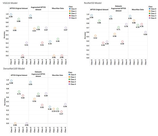 A closer study of the plots in Figure 11 shows that the three models were able to predict class 0, “No DR” cases, quite easily for both the original and augmented APTOS datasets; however, only the ResNet50 model was able to classify “No DR” cases for the Mauritius dataset. This is to be expected since class 0 is quite distinct from the other classes given the absence of DR features such as microaneurysms.