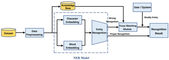 First, we preprocess the obtained data and utilize these data to generate a simple knowledge base. The processed data are input into the NER model for training and prediction. We will try to retrieve the entities recognized by the NER model in the knowledge base (exact matching). For entities that cannot be retrieved from the knowledge base in the recognition result (wrong recognition in Figure 1), the fuzzy matching module will generate an entity set and provide it to the user or the system for selection. The selected entity will be the topic entity of this query.