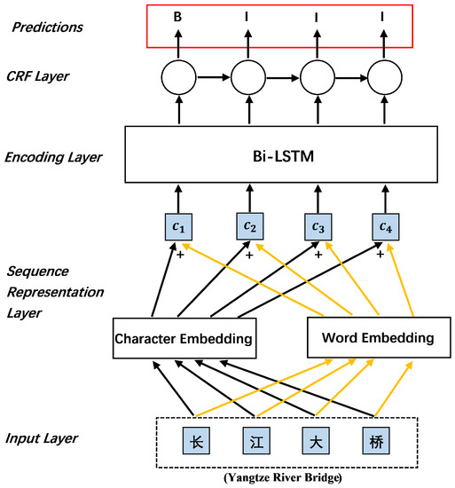 - Ma, X.; Hovy, E. End-to-end Sequence Labeling via Bi-directional LSTM-CNNs-CRF. In Proceedings of the 54th Annual Meeting of the Association for Computational Linguistics, Berlin, Germany, 7–12 August 2016; Volume 1: Long Papers, pp. 1064–1074. [Google Scholar]