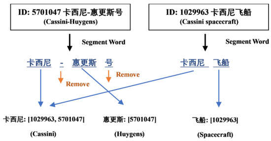 An example of the process of generating the word segmentation dictionary. (Words “卡西尼-惠更斯号” (Cassini–Huygens) and “卡西尼飞船” (Cassini Spacecraft) are entities stored in the knowledge base. The [1029963, 5701047] is the ID set of the segemented word “卡西尼” (Cassini), and so on).
