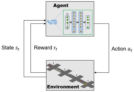 Meanwhile, the traditional traffic signal control methods will be gradually eliminated in some urban areas with the development and construction of smart cities. ATSC is becoming a promising way to alleviate mounting traffic congestion. As an important part of an intelligent traffic system (ITS), ATSC approaches change the signal state in real-time according to the traffic flow with the intent to reduce vehicle delay []. In particular, the reinforcement learning (RL) technique is one of the most up-and-coming approaches to implementing ATSC in terms of its learning-based mechanism. By combining with the deep learning method, deep reinforcement learning (DRL) shows great potential to solve decision-making problems like ATSC [,]. As far as the application is concerned, the DRL-based traffic signal control method is accomplished in the real world by fusing multi-source data. The application of the ATSC in Shenzhen, China, brings about more smooth traffic and less vehicle delay [].