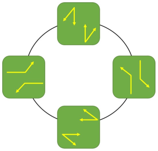 - Action: The action in this paper is defined as : switch to the next phase, and : maintain the current phase. The action is carried out with the interval of s, while the specific definition of the signal phases is given in Figure 2. It should be noted that a 3 s yellow phase will be inserted if the phase changes.Figure 2. The phase diagram for the traffic signals in this paper.
