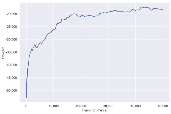 For every episode of the training process, the simulator takes to load the vehicle into the road network and then train the agents. There are five traffic signal agents in accordance with Figure 6. Each agent learns independently, which means that it only considers its observation and action. The simulation duration of each episode is , and the training process takes a total of 50,000 s. Finally, the coverage curve is presented in Figure 3.