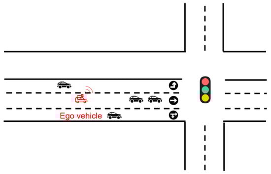 Fickle driving behaviors can easily lead to increased carbon emissions and energy consumption [], which then becomes a source of global warming and the greenhouse effect. In order to build a eco-friendly transportation system, the application of electric vehicles and advanced driving strategies is necessary []. In this case, energy efficient driving, also known as “eco-driving”, is an important way to achieve energy conservation and emission reduction for vehicles []. It is usually implemented by avoiding sudden acceleration and reducing idling time [], whereas frequent acceleration/deceleration, slow movements, and idling are the main factors affecting vehicular energy consumption. Generally, both freeway [,] and signalized intersections of urban roads are the primary scenarios for eco-driving [,], but the intersection scenario is more challenging because of the uncertainty of the changing signal phase and the evolving road traffic. Traffic signals and vehicle queues impose spatial and temporal constraints on the movement of the vehicle needed to be controlled (i.e., the ego vehicle) []. However, with the support of advanced vehicle-to-infrastructure (V2I) communication and vehicle-to-vehicle (V2V) communication, the uncertainty can be attenuated to help the vehicle make better decisions to cross the conflict area [].
