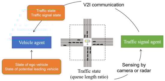 As shown in Figure 5, the sensed traffic state is taken as the input of traffic signal agents in an ATSC environment. Since the accurate change rule of the traffic signal phase is not clear, the vehicle agent is supposed to understand the dynamics of the traffic signal agents. From this point of view, the input state of the traffic signals can be part of the state of vehicle agents, utilizing the V2I communication to transmit the information. In addition, some other related states are collected to form the decision basis of the ego vehicle. The comprehensive design of the state vector of the CV, which is enhanced by the state sharing mechanism between the heterogeneous agents, is promising to help the CV catch the regular pattern of the adaptive traffic signals.