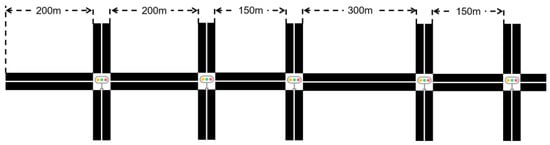 A signalized corridor scenario is established in SUMO, which can be shown in Figure 6. The lane configuration for each intersection is the same as Figure 4. For each episode of train or evaluation, the traffic will be loaded in the first s with a random arrival rate. Then the ego vehicle is inserted into the leftmost lane. The preloading procedure is to simulate the real traffic situation, that is, the ego vehicle can be influenced by some other vehicles. After that, the ego vehicle will cross the subsequent five signalized intersections with the support of the PPO algorithm. An episode of simulation will be terminated when the ego vehicle has crossed the last junction. Moreover, the transitions of each episode of simulation will be recorded and saved to prepare for the explanation process based on SHAP.