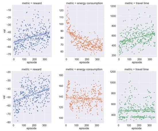 Table 2 shows the metrics performance for different combinations of the parameters. It can be seen that an increase of and can improve the corresponding indicators to a certain extent in general, while the mean jerk is not sensitive to the change of . Nevertheless, the increase of does not necessarily reduce the travel time on some occasions. We infer that the weighting parameter with a high value encourages the agent to choose a more aggressive and greedy strategy, and this kind of strategy may be limited by the uncertain environment. The same is true of . Besides, the mutual restriction of the three parameters will also exert an unexpected influence on the vehicle. Therefore, a compromising scheme is selected in this study. Concurrently, this provides plasticity for the control law. We can choose the parameter configuration with low travel time to improve the traffic efficiency if the travel is sensitive to the travel time. Similarly, we can also choose the configuration with low energy consumption to save electricity to the greatest extent. From Table 2, we can conclude that the energy consumption can be reduced by , while the sacrifice of travel time is .