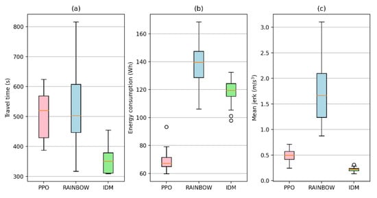 The evaluation results for PPO, RAINBOW, and IDM. (a) Travel time; (b) Energy consumption; (c) Mean jerk.