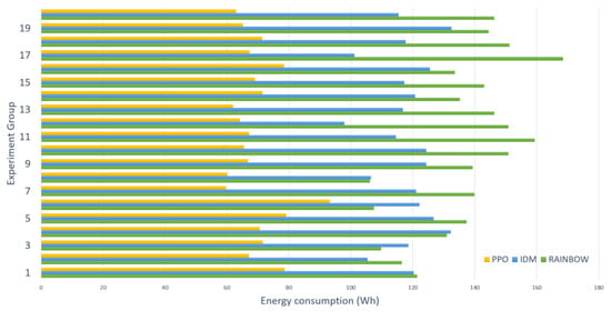 Figure 9 presents the results in terms of electricity consumption for 20 groups of independent simulation-based evaluations in detail. The figure demonstrates that the proposed method lowers the consumed energy steadily compared with IDM, which is deemed as representative of normal human driving behavior. By contrast, the results produced by RAINBOW can be even worse than the baseline in most cases, further proving that the value-based algorithm with discrete action space cannot fit into the environment with high uncertainty.