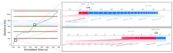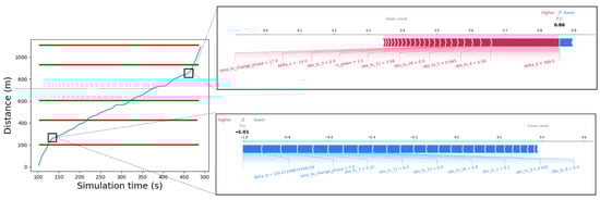 Taking Figure 11 as an example, more quantitative analysis can be conducted. The “base value” in the SHAP chart denotes the mean value of the acceleration in the whole episode of the simulation. The acceleration of the upper box in Figure 11 is , which is the result of the incentive effect of the features. Similarly, almost all of the features prevent the agent from accelerating for the situation in the lower box, so the action of the agent is . Meanwhile, the base values in the sampled trajectories are small. It means that although the trajectory of the vehicle is not so smooth, the acceleration and deceleration range of the vehicle is relatively small. This can help the vehicle save energy and improve comfort.