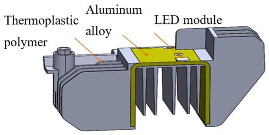 Figure 4 illustrates the recommended design for the LED headlight radiator with thermoplastic polymer and insert-molded aluminum alloy parts; the cases of the thermoplastic polymer, aluminum alloy part, and LED module can be seen in the figure.